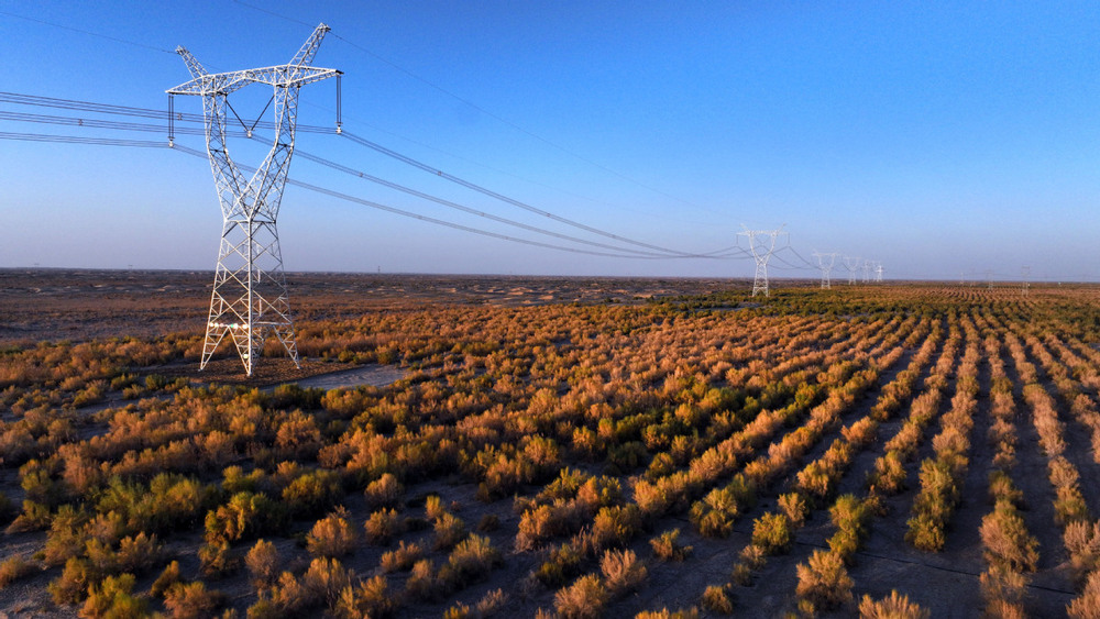 2025年10月18日,民丰—且末—若羌750千伏输电线路工程与胡杨林和谐共处。(马元 摄)