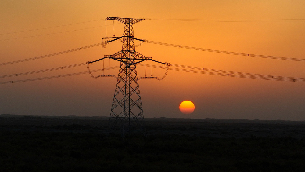2025年10月18日,落日余晖中的民丰—且末—若羌750千伏输电线路工程。(马元 摄)