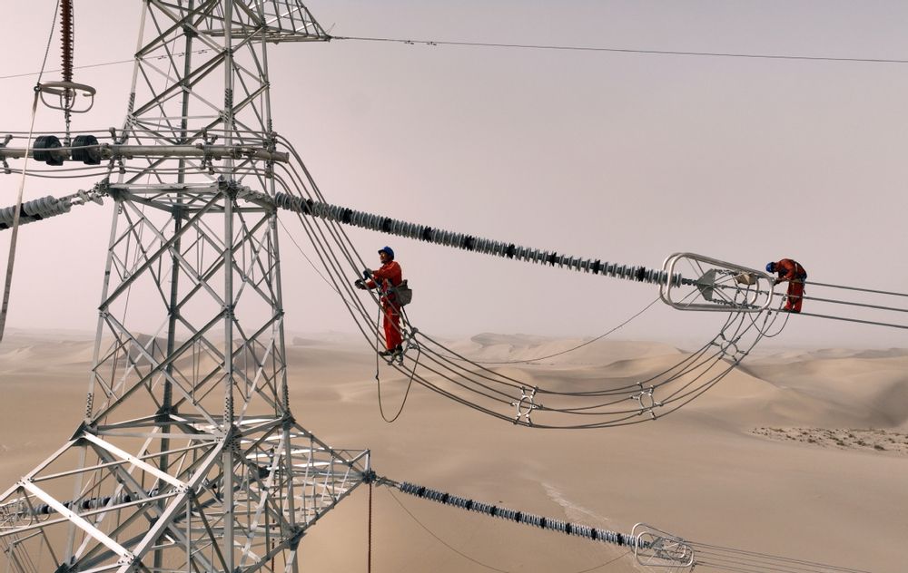 2025年6月25日,民丰—且末—若羌750千伏输电线路工程穿越“死亡之海”塔克拉玛干沙漠。(马元 摄)